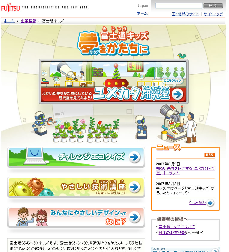当社は本日、小学校高学年向けのWebサイト「富士通キッズ:夢をかたちに」(http://jp.fujitsu.com/about/kids/)を開設します。メインのコンテンツとなる「ユメカタ研究室」では、「手のひら静脈認証」「カラー電子ペーパー」「植物性プラスチック」など、これまで当社がかたちにしてきた夢・技術の一例を楽しいイラストやアニメーションでご紹介します。当社が2002年より実施しているアクセシビリティ(注1)の取り組みを活かし、「技術」の素晴らしさを楽しみながら学んでいただけるサイトを目指します。