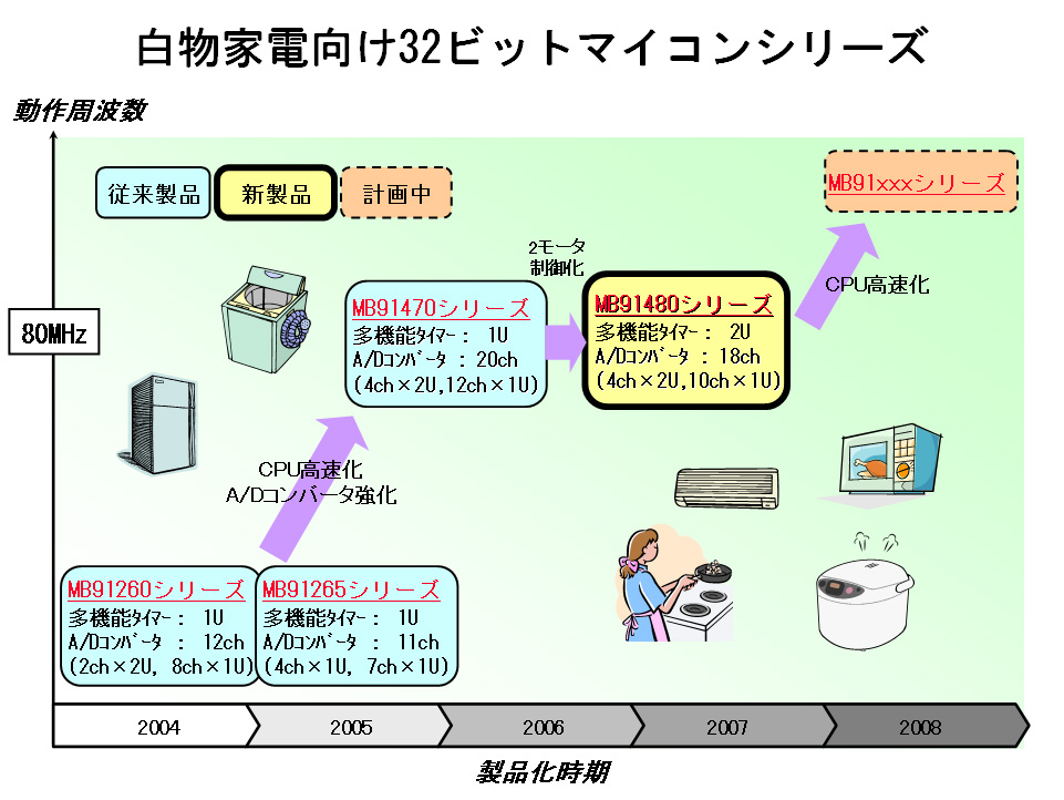 当社は、このようなニーズに応えるため、32ビットマイコン「FR」ファミリーに「MB91F480」シリーズを追加します。本シリーズの第一弾製品「MB91F487」は、モーターのインバーター制御を行う多機能タイマーを2ユニット搭載しており、1チップで2つのモーターに対応できるため、製品の省スペース化、高機能化に貢献します。
