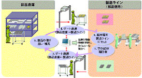 当社はこのほど、UHF帯RFID(無線タグ)を使った「部品供給のリアルタイム管理システム」を開発し、当社那須工場で、2007年2月より稼動を開始しました。これは、工場内の部品倉庫と製造ライン間において、部品の供給に使用する箱(以下、給材箱)にUHF帯RFIDを取り付け、このタグ情報を一括で読み取ることにより、部品の移動情報をリアルタイムで自動的に収集・管理し、この情報にもとづき、タイムリーな部品発注を実現するものです。