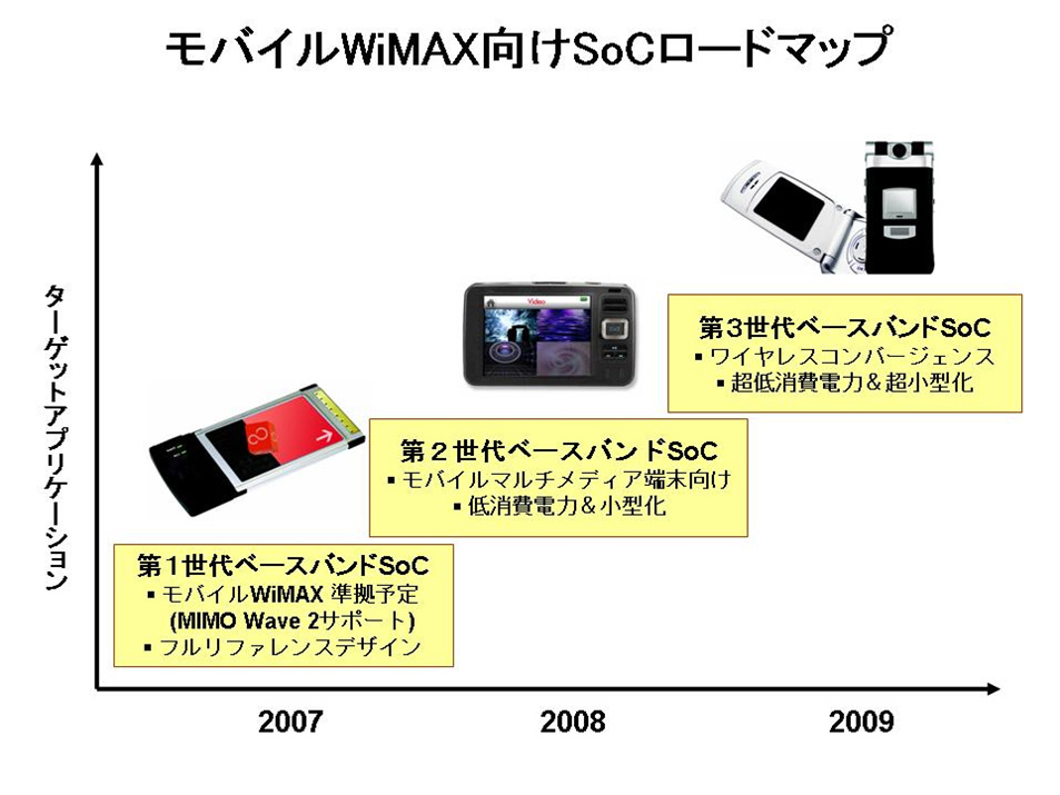 本製品は、すでに出荷を開始している固定WiMAX(注3)チップから得られたノウハウと、3G携帯電話用ベースバンド(注4)チップ開発から得られた低消費電力技術をもとに、株式会社富士通研究所(注5)と共同で開発したモバイルWiMAXの端末向けベースバンドチップです。