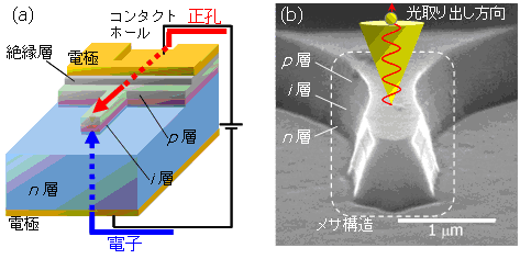 電流注入により波長1.55μm帯の単一光子発生を実現するために、量子ドットを発光ダイオード(LED)構造の中に埋め込み、電流注入により単一の量子ドット発光を実現するデバイス構造(図1)を新たに設計し、同時に、設計どおりの構造を実現するためのプロセス技術を開発しました。とくに不純物ドーピング構造、単一量子ドットからの発光を取り出す光学構造やコンタクト電極の新たな形状を考慮するなどで、課題を克服しました。