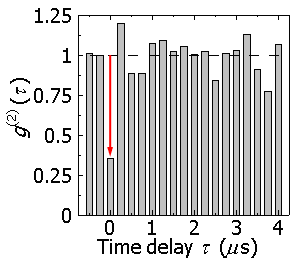 今回開発した単一光子発生素子を用いて、光子相関法(注5)による単一光子発生検証実験を実施した結果(図2)、同時(τ = 0)に2つの光子を検出する割合が1よりも大きく下がり、光子が1個か0個の状態であるアンチバンチング現象(注6)を観測しました。これから波長1.551μmの単一光子発生を確認することができました。