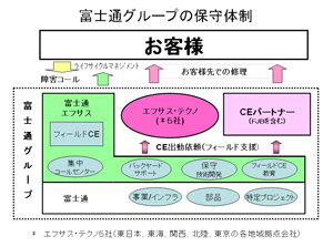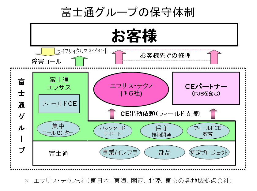 お客様先での保守サービスに関しては、これまでお客様のIT活用の高度化に対応し、富士通エフサスと、富士通エフサスの全額出資子会社であるエフサス・テクノ株式会社を始めとする富士通エフサスの関係会社(注3)、およびCEパートナーによる体制を通じてサービスを提供してまいりました。