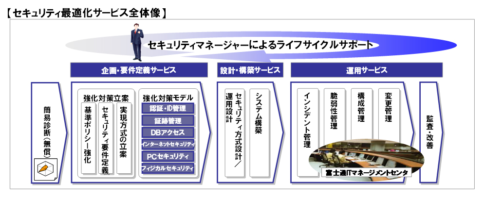 「セキュリティ最適化サービス」は、セキュリティのリスク分析・可視化に基づき対策の提示を行う「企画・要件定義サービス」、最適な対策方法を選定しシステムの設計・構築を行う「設計・構築サービス」、24時間365日の監視、継続的な改善提案などを行う「運用サービス」で構成されており、セキュリティマネージャーがお客様の専任窓口となり一貫したセキュリティ対策を提供するとともに、これを継続的にサポートします。