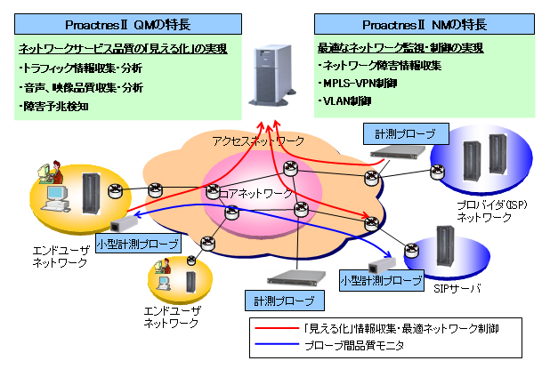 近年、ネットワーク技術の発達に伴いブロードバンドが普及し、IP電話や映像配信といったさまざまなサービスがIPネットワーク上で提供されるようになりました。これらのサービスの社会的重要性が高まる中で、ネットワークインフラは大規模で複雑なシステムになり、運用管理や問題発生時の対処が困難になっており、ネットワークサービスの品質管理とネットワークインフラの運用管理はサービス事業者にとって非常に重要な課題となっています。当社がこのたび開発する「ProactnesⅡ」は、これから始まるオールIPの次世代ネットワークを見据え、ネットワーク上で提供されるサービスの品質向上を支援するとともに、その効率的な運用管理を実現するネットワークサービス管理ソリューションです。