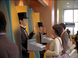 近未来の、とある銀行のATMコーナー。順番待ちの列から、大きなバッグを抱え、財布とキャッシュカードを手に恐る恐るATMに近づいていく女性は、デザイン会社勤務のOLに扮する松たか子さん。ちょっと戸惑った彼女の視線の先にいたのは、バトラー風の男性。片手を上げてスタンバイしています。キャッシュカードをATMに差し込み、不安そうな顔で見上げると、男性が松さんに自分の手のひらに手をかざすよう促します。松さんがおっかなびっくり男性の手に自分の手をかざすと、“ピッ!”とATMが反応します。