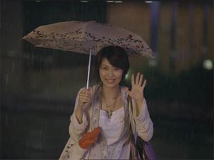 夜のシーンは、都内の閑静な住宅街のマンション前で撮影しました。設定が「雨の中」ということで、周りに雨降らし機を数台セット。本番では松さんが傘を差している辺りに、スタッフが数人がかりで水を放出し、「雨の中」を演出しました。この日最後のシーンということで、本番は夜12時近い時間に始まりましたが、松たか子さんのCM撮影ということで、現場の周りにはみるみる人だかりができ、多くの観衆に見守られながらの収録となりました。
