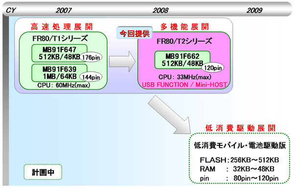 当社は、32ビットマイコン「FR」ファミリーとして、デジタル家電向けに高速動作版「FR80/T1シリーズ」の提供を開始したのに引き続き、第2弾として、「FR80/T1シリーズ」の持つ高速のA/Dコンバーターや豊富な通信機能に加え、USBなどの通信機能を強化し、かつ低消費電力での処理を実現する「FR80/T2シリーズ」を追加します。「FR80/T2シリーズ」のマイコン「MB91F662」は高速動作版「FR80/T1シリーズ」に比べCPUコアのクロック周波数を落とし消費電力を低く抑えた上で、USB2.0機能を付与することで、フォトプリンタ、ラベルプリンタ、オーディオ機器などの民生機器やFA機器を制御するコントローラーやインバーター制御機器などにUSB機能を実現します。