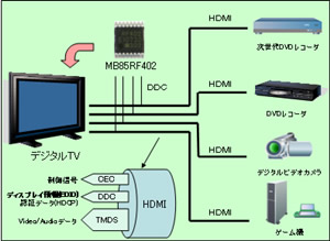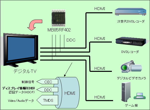 本製品は、HDMI™コネクター4ポート分のディスプレイ情報用メモリを1つのFRAMに集約することで、デジタルテレビの多彩な使い方とコストダウンを実現します。