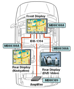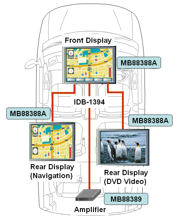 当社は、今後需要の伸びが見込まれるリアシートエンターテインメント分野に向け、IDB-1394コントローラーLSIとして、カーナビゲーション映像およびビデオ転送向けの「MB88388A」、オーディオ転送向けの「MB88389」を富士通VLSI株式会社(注3)と共同で開発しました。