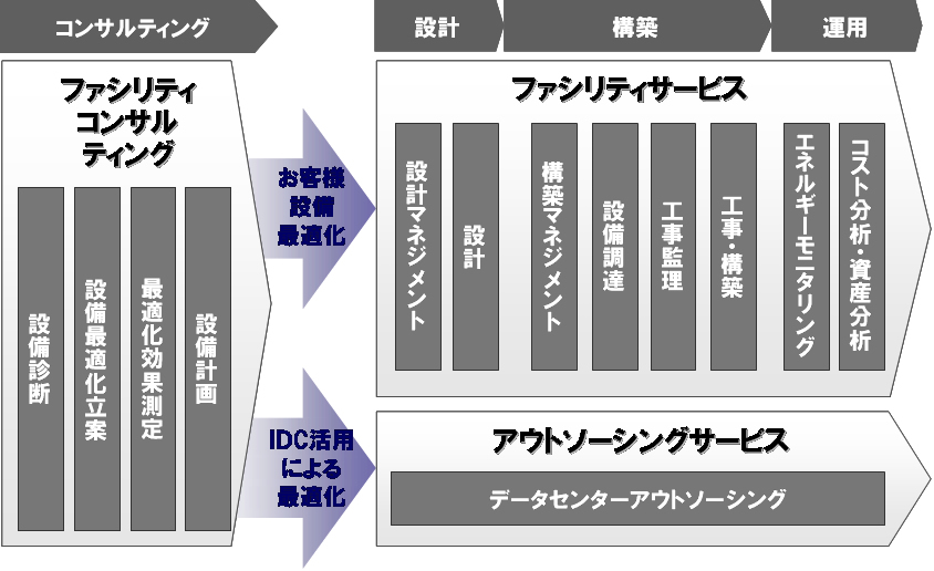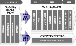具体的には、設備状況の診断から最適化立案まで行なう「ファシリティコンサルティング」、お客様の持つマシンルームやデータセンターにおける省電力環境の最適化を、設計・構築から運用段階まで実施する「ファシリティサービス」、当社データセンターに設置されたお客様のITファシリティの省エネ化・効率化を設計・構築から運用までサポートする「アウトソーシングサービス」を提供します。