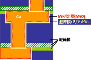 このMn析出層がバリアメタルの酸化を抑制するため、超薄膜のバリアメタルで、従来のバリア性能を維持することが可能になりました。
