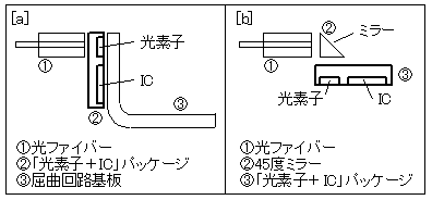 今回、これらの課題を解決するために、光ファイバーと光素子の「直接」結合、および光素子とICを微小空間内部で接続する「屈曲電気配線」を実現する技術を開発しました(図3)。