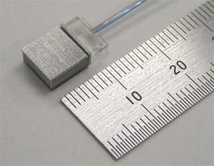 今回開発した技術を用いて、長さ9mm×幅8mm×高さ4mmの40Gbps(10Gbps×4チャネル集積)超小型光リンクモジュールを試作(図4)し、現在、業界標準品では最小となるSFP+モジュールに比べて10分の1以下のサイズに小型化できることを検証しました。