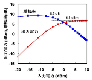 上記の2つの技術の組み合わせにより、世界で初めて77GHz における増幅器の動作で、8.5dBの増幅率と6.3ディービーエム(以下、dBm)の飽和出力を達成しました(図1)。さらに今回、60GHzの周波数において、8.3dBの増幅率と10.6dBmの飽和出力を達成した増幅器も実現しています。