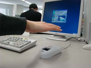 ![]() <愛知県信用保証協会様で手のひら静脈認証装置「PalmSecure」を使ったPCログインの様子> |