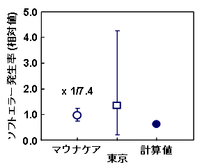 東京とマウナケナ山頂で測定したところ、マウナケナ山頂での中性子線の強度は東京の約16倍、さらに遮蔽効果により東京の7.4倍という結果を得ました。また、マウナケア山頂で測定したソフトエラー発生率に、7.4分の1倍を掛けて算出した値は、東京で測定した従来のデータや計算値にほぼ一致しました。