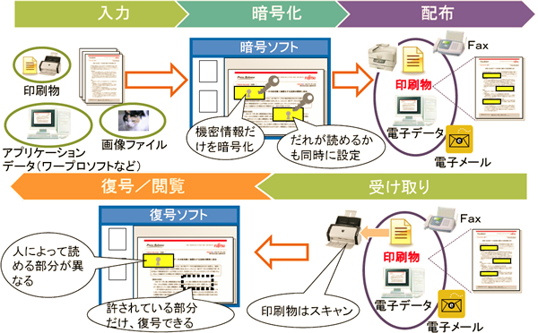 株式会社富士通研究所(注1)はこのほど、紙や電子データ内の機密情報を部分的に暗号化し、許可された人だけが特定の暗号化された領域を閲覧することができる技術の開発に、世界で初めて成功しました。本技術により、印刷物や電子データを配布する際に、個人情報など漏えいを防ぐ必要のある部分のみを暗号化することが可能になり、ドキュメントのセキュリティが大幅に向上し、安心して組織内外での情報共有を行うことができます。
