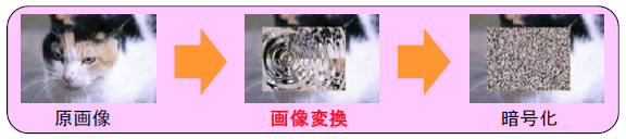 今回、画像スクランブル(注5)をベースに、セキュリティの強化と画質劣化後も復号を可能にする画像変換を加えた暗号化技術を開発しました。(図2)