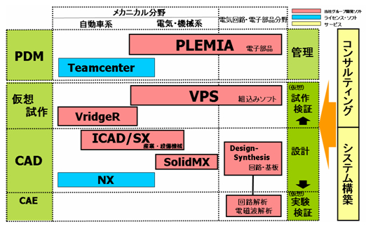 | 事業内容 | : | 自動車分野をはじめとする機械製品の企画、開発、保守に必要となるPLMソリューションの開発および提供。主なPLM製品に、三次元CAD「ICAD/SX」、デジタルプロダクションツール「VridgeR(ブリッジャー)(注4)」、「SolidEdge(ソリッドエッジ)(注5)」、「NX(注6)」、PDMソフトウェア「Teamcenter(チームセンター)(注7)」などがある。 |
