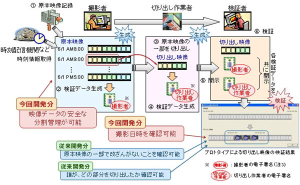 株式会社富士通研究所(注1)(以下、富士通研究所)はこのほど、長時間撮影されたデジタル映像データにおいて、分割して保存・管理したり、一部を切り出した場合でも、その映像がもとの映像の一部であり、改ざんがないことや、撮影された時刻の確認を可能にする技術を、世界で初めて開発しました。これにより、24時間撮影を行う監視カメラなどのシステムで、映像データの一部を公開する際に、その映像データに対して改ざんが行われていないことを保証することが可能になります。