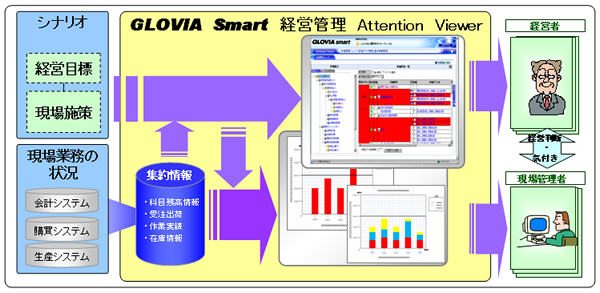 当社は、中堅企業向け統合ERPパッケージソリューション「GLOVIA smart(グロービア・スマート)」の新しいラインナップとして、中堅企業の経営者と現場管理者のマネジメント活動を支援する、経営の見える化ソリューション「GLOVIA smart 経営管理 Attention Viewer(アテンション・ビューア)」を開発し、本日より販売開始します。