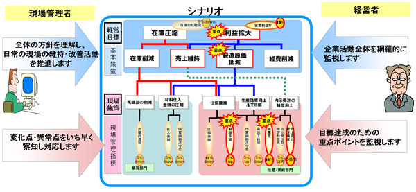 たとえば、いくつかある経営目標の中で「利益拡大」「製造原価低減」が最も重要な目標であることが現場の社員まで共有されれば、各部門ではその目標につながる「仕損撲滅」や「生産効率向上」などの施策を最優先として活動することができます。また、「製品歩留」や「操業度」などの指標に基づき、各施策の進捗状況を管理することにより、目標と現状の差異がデジタル化され状況がより明確になり、メリハリのある徹底したマネジメントが可能になります。