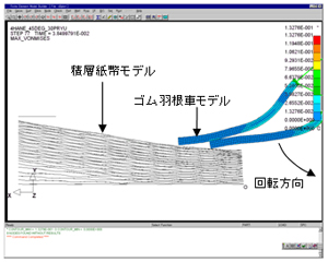 ゴムとシート間における特殊な摩擦挙動のシミュレーションを行う技術を開発しました。「LS-DYNA」の機能を使って、接触定義(注5)の最適化およびゴムとシートが接触した時に生じる力を表現する方法を開発することにより、特殊な摩擦挙動のシミュレーションを行うことが可能になりました。