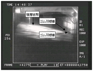 今回開発した技術を、ATMの紙幣収納機構の開発に適用して実証実験を行ったところ、収納・積載スタッカ(注6)において、排出されてきた紙幣を高速回転するゴム製羽根車で引き寄せて端部を揃える挙動のシミュレーション画像と、高速度カメラによる実写映像がほぼ一致し (図1、図2)、シミュレーションが実機現象を再現していることを確認しました。