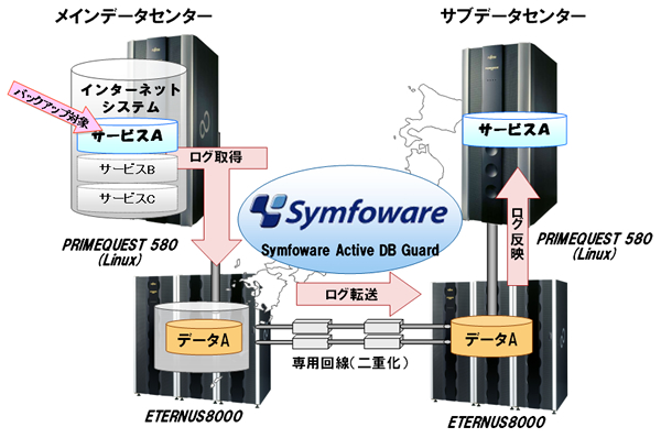 「ETERNUS8000」と「Symfoware Active DB Guard」により、データベース更新時に生成される更新差分のログファイルのみをリアルタイムに転送し、必要最小限のデータ転送量による両センター間の連携を実現しました。
