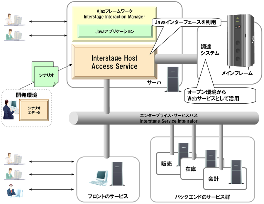 「Interstage Host Access Service」は、メインフレームのアプリケーションをオープン環境から利用するためのアダプティング機能を提供するソフトウェアです。メインフレーム(当社GSシリーズ・PRIMEFORCEシリーズ)とオープンクライアントの間のサーバに導入することで、メインフレームのアプリケーションには手を加えることなく、オープン環境からWeb業務として活用できるようになります。また、本商品は、エンタープライズ・サービスバス(ESB)(注2)と連携することもでき、メインフレームの業務をWebサービス化し、SOAに基づくシステムへと発展させることが可能です。