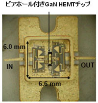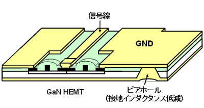 一方、動作電圧の高い窒化ガリウムHEMTをMMICに適用するには、チップ上のコンデンサの耐圧が実用上不十分でした。これに対して、トランジスタとコンデンサを別々に実装するハイブリッド型回路では、高い耐圧のコンデンサを使用できるため、耐圧の問題はなくなりますが、信号線の接続や接地に用いるワイヤにより高周波信号の増幅率が低下し、周波数変動が増大するため、高い効率を広い帯域にわたって実現することが困難でした。