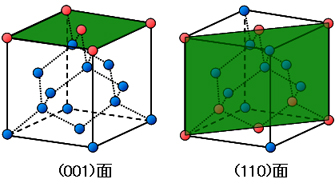 現在、シリコン基板の表面は NMOSトランジスタ(以下、NMOS)の移動度が高い(001)面(図1)が主流となっています。しかし、45nm世代まで使用していた既存の製造設備では、 (001)面のオン電流を向上させることは難しくなっています。これに対して、(110)面(図1)は、PMOSトランジスタ(以下、PMOS)の移動度が(001)面よりも高くなることから注目されていますが、NMOSの移動度が(001)面よりも低いといった問題がありました。このため、「NMOSのオン電流+PMOSのオン電流」の合計は(001)面の方が大きくなり、(110)面の基板への適用は実用化されませんでした。(110)面を基板とした低消費電力ロジックLSIの実用化には、製造コストの増加を最小限に抑えながら、NMOSのオン電流を(001)面と同等レベルに向上させる必要があります。