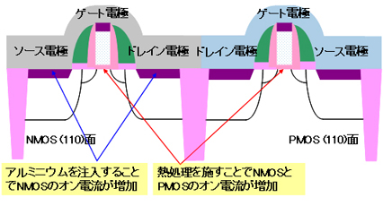 シリサイド形成後にアルミニウムを注入することにより、NMOSのシリサイドとシリコンのコンタクト抵抗(注10)が減少することを見出しました。アルミニウムをシリサイドの極浅領域に注入することで、NMOSのオン電流を20%向上させました。さらに、シリコンの表面処理技術と併用することで、(110)面のシリコン基板を用いても、(001)面と同等のNMOSのオン電流を実現させました。