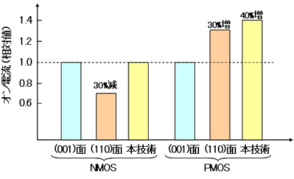 今回、世界で初めて、既存の45nm世代の製造設備で(110)面のシリコン基板を適用しながら、(001)面と比較してNMOSのオン電流を減少させることなく、PMOSのオン電流を向上させることが可能な32nm世代向けの新技術を開発しました。(図2)