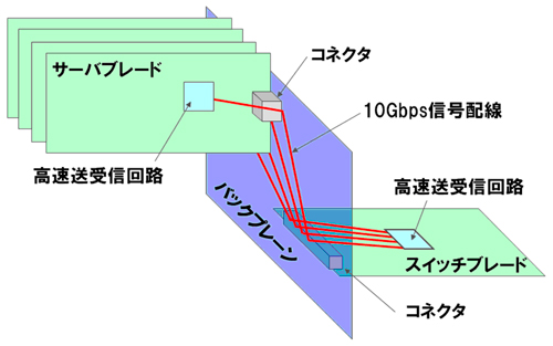 ITシステムにおいて、サーバの設置スペース削減や運用の効率化を目的に、ブレードサーバと呼ばれるCPUやメモリなどのサーバの機能を搭載した回路基板(以下、サーバブレード)を複数接続するサーバシステムが活用されています。ブレードサーバの高性能化を実現するために、複数のサーバブレードを相互接続する通信用の回路基板であるバックプレーンで、10Gpbsレベルの高速な伝送と、さらにその伝送を多チャネル化して高速化する技術が開発されています(図1)。一方、近年、グリーンITを実現するIT機器の省エネ化、高密度化に関心が高まり、サーバブレードおよび、サーバブレード間の伝送の中継を行なう回路基板(以下、スイッチブレード)に搭載される高速送受信回路に関しても、高性能化のみならず、省電力化、高密度化が求められています。