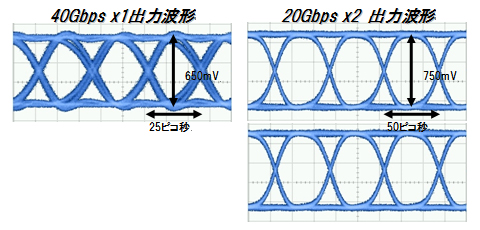 開発技術を適用した送信ICの出力波形は、図3のように安定しており、実用上求められる電源電圧の変動範囲で、確実に"0"と"1"が判定可能な40Gbps出力信号が生成できることを確認しました(データ誤り率10-12以下、すなわち1兆個のデータに対して1個以下の誤り)。この結果、本技術が、電源電圧の変動だけでなく、送信ICの使用温度の変化による影響に対しても有効であることを確認しました。
