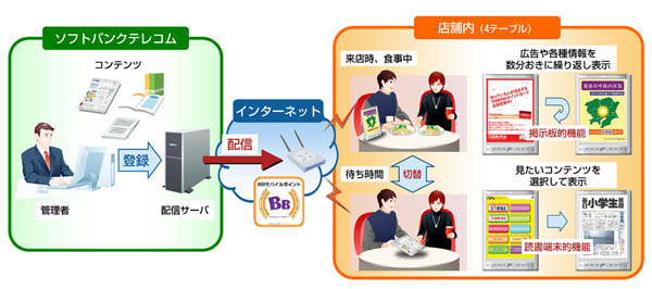 レストラン内にカラー電子ペーパー端末「FLEPia」を4台設置し、来店のお客様に無料で利用いただきます。注文待ちのときは端末を自由に操作して、毎日小学生新聞などを読むことができます。また、食事中など端末を操作しないときは、テルミナや不二家レストランの販促情報、JR時刻表、天気予報などの情報に自動的に切り替わり、さまざまなコンテンツが数分おきに繰返し表示されます。コンテンツなどはBBモバイルポイントを経由して、定期的に更新されます。