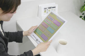 カラー電子ペーパーを一般消費者が実際の店舗で手に取り、無線配信された新聞や広告を見ることができる初の実証実験です。レストラン内のテーブル上に、富士通フロンテックのカラー電子ペーパー端末「FLEPia(フレッピア)」を置き、無線LANサービスの「BBモバイルポイント(注1)」を通して毎日小学生新聞の紙面などを来店されたお客様に自由に見ていただくことができます。本実験を通して、電子ペーパーが新聞などを読む端末として消費者に受け入れられるか、また、店舗にとって顧客満足度向上に効果があるかを検証します。