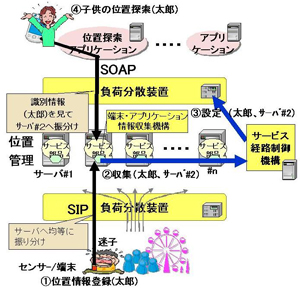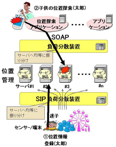 今回、ある施設内を移動する訪問客の位置情報に応じて、従業員を最適に配置するサービスのアプリケーションを試作しました。複数の訪問客の位置情報を、SIPを介して複数のサーバに登録し、その位置情報を、SOAPを介して参照するアプリケーションのメッセージが、それらのサーバの中から対応するサービス部品が実行されている適切なサーバへ振り分けられ、サーバの負荷分散が実現できることを確認しました。