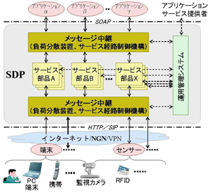 株式会社富士通研究所(注1)(以下、富士通研究所)は、ネットワーク機能を持ったソフトウェアの部品をアプリケーションに提供するService Delivery Platform(以下、SDP)において、端末やアプリケーションの増加に対してサーバの負荷分散を実現するメッセージ中継技術を開発しました。本技術は、複数のサーバにソフトウェア部品を配置して負荷分散を行う際に、異なる通信プロトコルを用いる数多くの端末やアプリケーションとソフトウェア部品との間でやり取りされるデータ(以下、メッセージ)とソフトウェア部品とを対応づけることで、適切なサーバのソフトウェア部品にメッセージを受け渡すことができることを特長としています。本技術により、ソフトウェア部品を活用するアプリケーションの提供者は、アプリケーションの利用者や端末の増加を気にすることなく、さまざまな新しいサービスを提供できます。