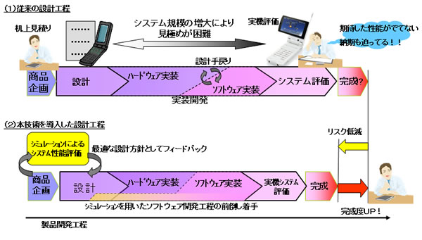 携帯電話のようにハードウェア、ソフトウェアが急速に進化・大規模化している製品の開発において、設計の初期段階でシステム性能を総合的・定量的に見積もる要望が高まっています。たとえば、軽快な操作感を実現するために応答性能が必要なGUIのように、多くの機能が複雑に作用しながら動作するシステムの実機性能を、単純な机上試算(注3)で見積もることは困難です。また、見積もりと実機の性能差が大きな場合、設計手戻りや製品の機能制限が発生し、ビジネス機会の損失などといった事態に陥ってしまいます(図1(1))。