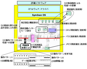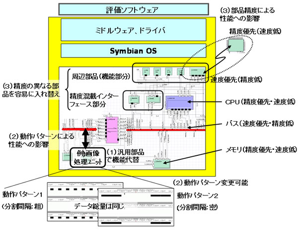 本技術をもとに、実際の設計段階にある携帯電話LSIをモデル化し、世界で初めてSymbian OS上で評価ソフトウェアを用いた評価環境を開発し、分析結果を設計にフィードバックしました。