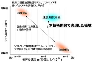 性能を正確に見積もるためには処理時間の精度(注4)が高いモデルが必要です。一方で、最適な設計方針を探求するためには、部品の組み合わせや設定変更を短時間で繰り返し実験できる高速なモデルが必要です。しかし一般に速度と精度は相反する関係にあるため、この2つを両立することは困難でした。