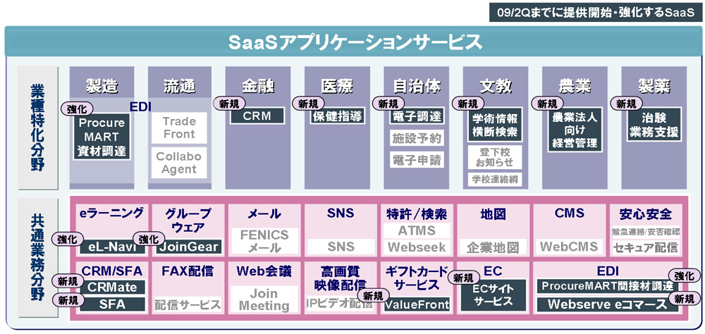 あわせて、自治体、医療などの業種とCRMやセキュリティなどの共通業務において、新規に11種のSaaSアプリケーションを開発、製造分野やグループウェアなどの既存の4商品の機能強化を図り、2009年度上期までに順次提供していきます。