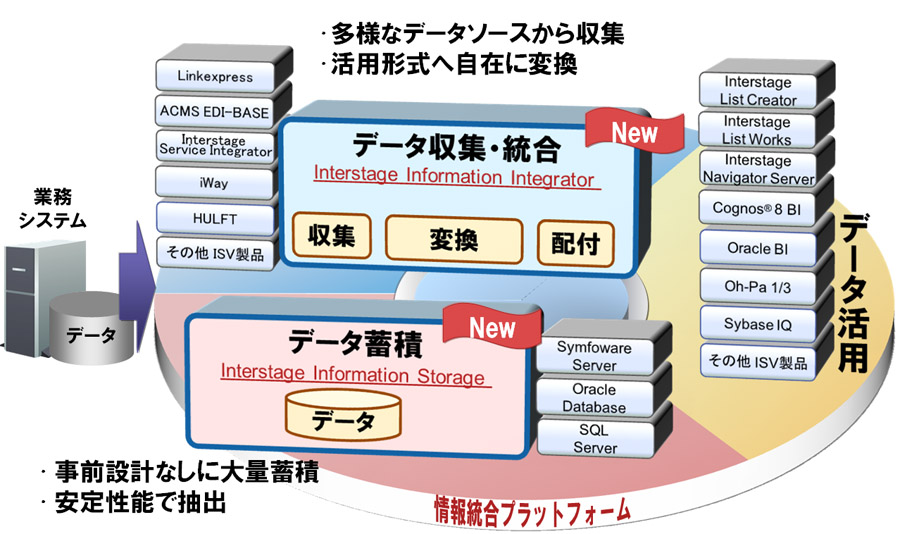 このような中、当社は、独自の最新データ処理技術と数多くのプロジェクトで培ったシステム構築ノウハウをもとに開発したソフトウェア「Interstage Information Integrator」、「Interstage Information Storage」を新たに販売いたします。