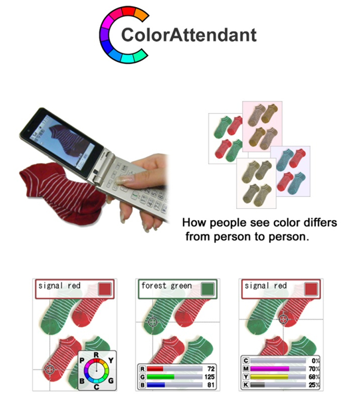 高齢者や障がい者の方々を含め、使いやすい携帯電話の開発に取り組んできました。「らくらくホン」シリーズは、開発当初から通算1440万台販売しているベストセラー機です。また、製品デザインに加え、お客様をサポートするソフトウェアのデザイン開発にも取り組んでいます。今回出展する「カラーアテンダント」は、携帯電話のカメラ機能を利用して色を判別するソフトウェアです。