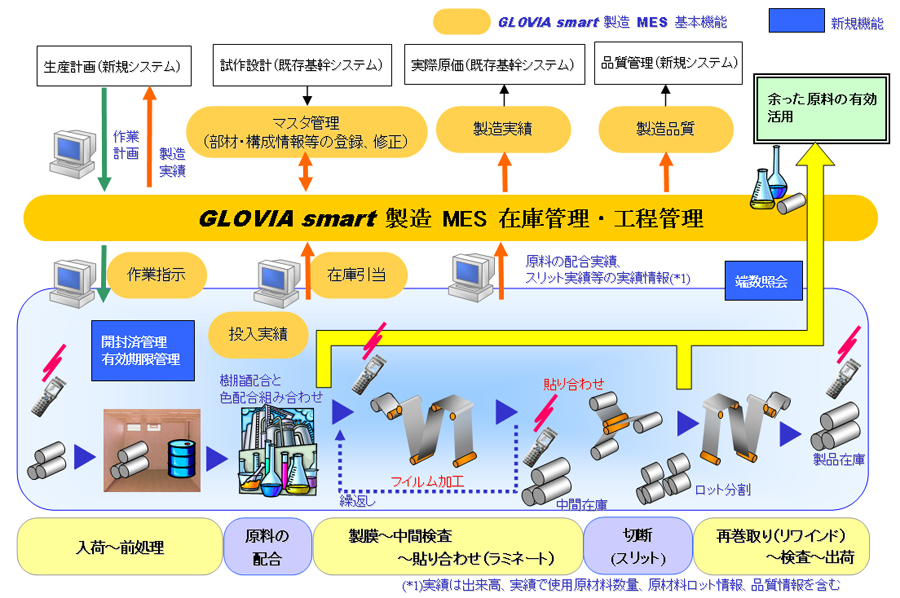 昨今、高価な材料を使用する高機能性フィルム業界では、生産工程で発生する端数の有効活用による原価率向上への期待が高まっています。しかし、生産品種の多様化に伴う生産工程の複雑化により、原材料、半製品、端数の形状や量、状態、品質、保管場所などをタイムリーに把握することが困難であり、使用可能か否かを判断できずに廃棄したり、有効期限切れによる品質劣化や廃棄などが課題になっていました。