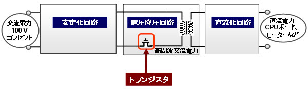 電源装置(図1)は、家庭用コンセントなどから供給される交流電力を、電子機器が動作するために必要となる安定した直流電力に変換します。供給される交流電力は不安定なため、まず電圧の安定化が行われた後、電圧を降圧し、最後に直流電力へ変換されます。電圧降圧回路では、トランジスタを用いて通電状態と遮断状態の切り替えを高速に行うことで生成する高周波の交流電力を利用しています。従来、電源装置にはシリコンのトランジスタが多く利用されていますが、シリコンのトランジスタでは通電状態における電力損失(オン損失(注6))と、通電状態と遮断状態を切り替える時の電力損失(スイッチング損失(注7))が大きいため、これらを合わせると、電源の電力損失のうちトランジスタに関わる損失は3分の1以上を占めています。そのため、電力損失の低い新しいトランジスタや回路の開発が活発に行われています。