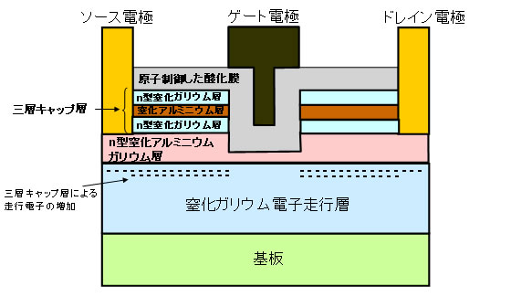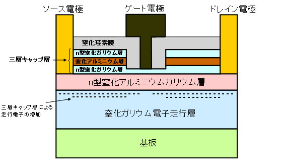 PC、家電、自動車などの電源装置の用途には、ゲート電極に電圧をかけない待機状態で電流を完全に遮断する機能が求められます。従来の窒化ガリウムHEMTは、待機状態で負のゲート電圧をかける必要がありましたが、昨年、富士通研究所では、無線通信装置の増幅器用途で、待機状態での通電を遮断できる独自の三層キャップ層構造(n型窒化アルミニウム層をn型窒化ガリウム層で挟んだ構造)の窒化ガリウムHEMT(図2)を開発しました。しかし通電状態と遮断状態を切り替えるためにゲート電極にかける電圧(以下、オン電圧)が +0.5 ボルト(以下、V)程度であるため、数百Vのドレイン電圧のかかる電源用途で一般的に求められるオン電圧の+2~+4 Vを満たすことができませんでした。また、実用的な電源装置として利用するにはオン電流密度として単位ミリメートルあたり600ミリアンペア(以下、mA/mm)以上が必要でした。